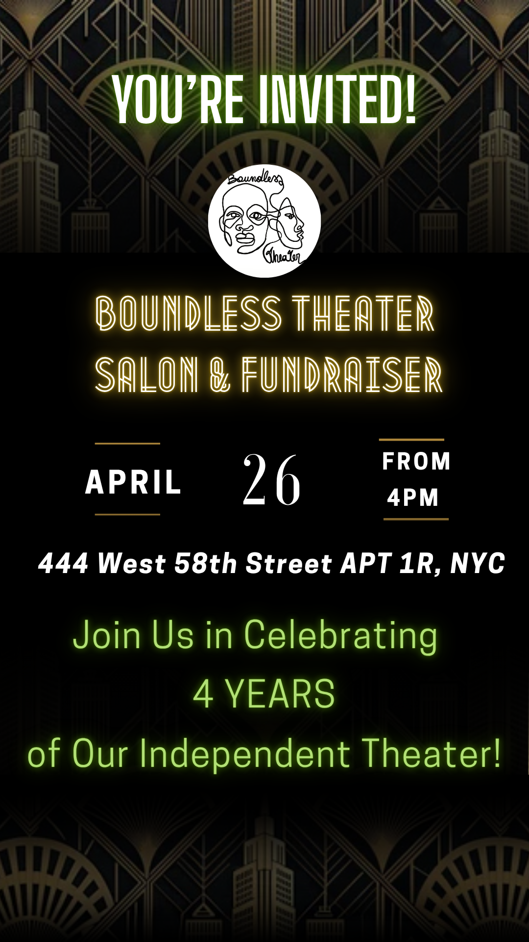 Tommaso Cartia & David James Parr β cofounders of Boundless Theater β are delighted to invite you to our upcoming Salon & Fundraiser celebrating our 4-Year Anniversary.
